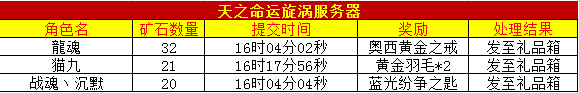 | 角色名 | 矿石数量 | 提交时间 | 奖励 | 备注 |