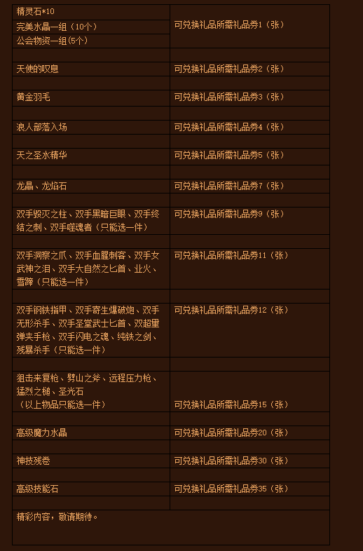 活动内容:活动期间内,每充入一张50金币卡可以获得一张礼品券,每充值一张150金币卡可以获得三张礼品券,多充多送。礼品券可以在活动指定页面兑换各种礼品。根据礼品券的多少可以兑换的礼品也有所不同,同一账号可以无限领取,充的越多送得越多!