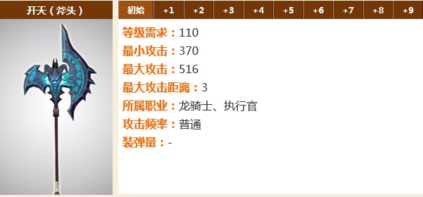 开天:西方混沌初开时期孕育出来的神器,在上古神魔大战时期遗失在神殿之中。该斧有开天辟地之能力。执行官、龙骑士两个职业可以使用。