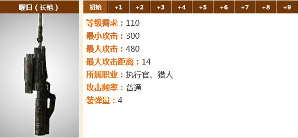 曜日:现代最新的科技产物,由伊凡手下最强大的科研组织研制而成的狙击枪,能在千里之外轻取他人首级。执行官、猎人两个职业可以使用。