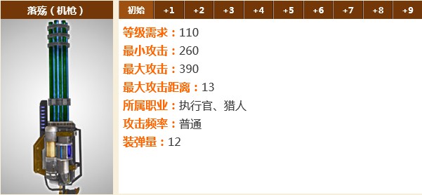 落殇:现代最新的科技产物,由伊凡手下最强大的科研组织研制而成的机枪,威力不言而喻。就算在普通人手中,也能横扫敌军,故名落殇。执行官、猎人两个职业可以使用。