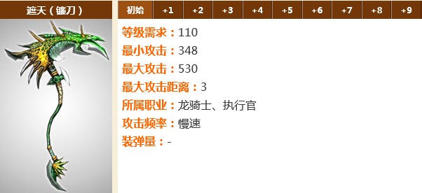 遮天:上古神魔时期用来抵御魔族入侵立下不朽战功的神器,可惜在后来遗失在神殿之中。该镰刀威力巨大,使用时能使风云变色,故名为遮天。执行官、龙骑士两个职业可以使用。