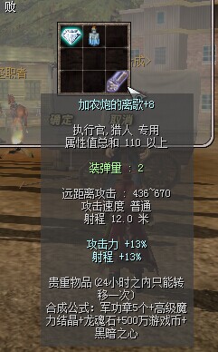 装备+完美水晶+保护符(可放可不放)=有几率出现单射程、单攻击或者双属性(攻击+射程)的前缀装备,最高合到双14(攻击+14%,射程+14%)