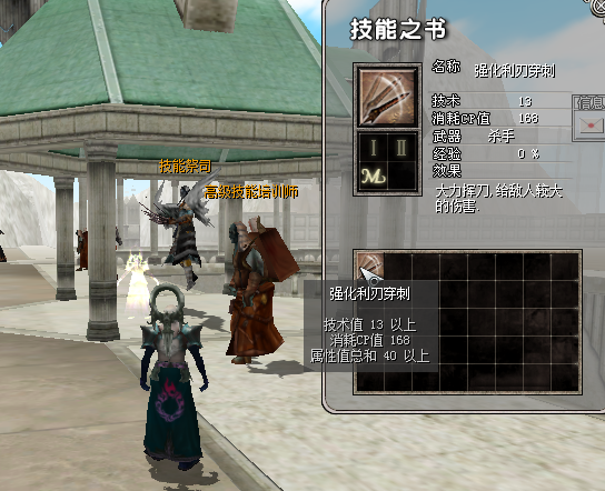 学习全新3阶段神技需要消耗:神技技能书+9个高级技能石,技能书放在技能快捷栏内,高级技能石放在人物背包,点击高级技能培训师即可